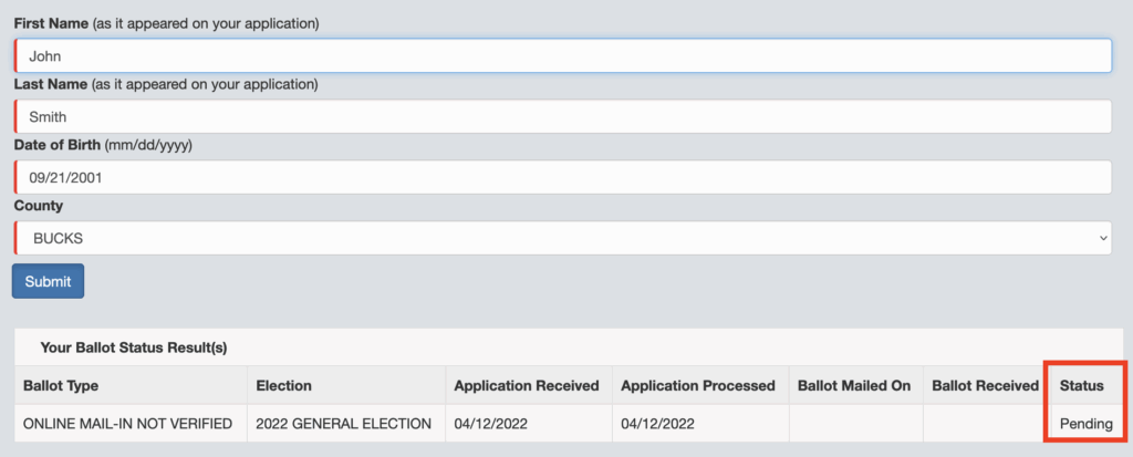 If your mail ballot has been successfully processed, you will see the word “Pending” in the Status field (See below image).