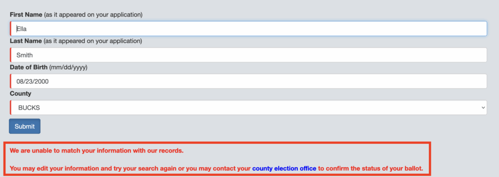 If your mail ballot has NOT been received you will see a message in red that reads “we are unable to match your information with our records” (See below image). This means your application has not been received and you will not be sent a mail ballot. You should either reapply or contact the Board of Elections at (215) 348-6154 or elections@buckscounty.org.